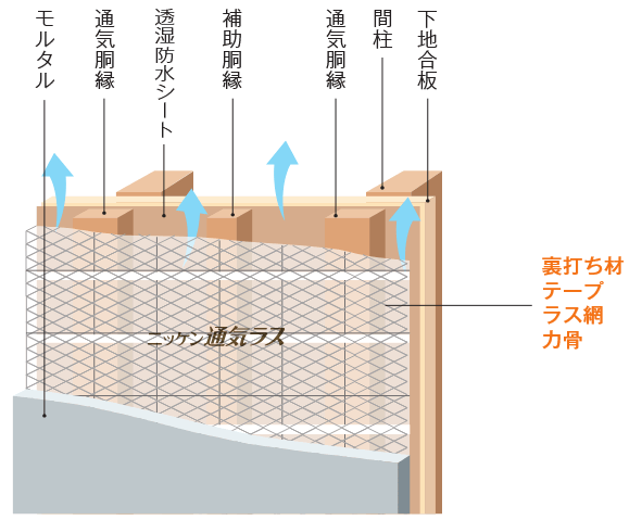 カ骨とラス材に防腐食性の高い亜鉛メッキ材を使用。
