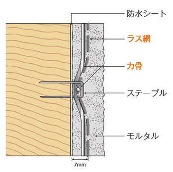 W-ラスは力骨の鉄線もラスの鋼板も、腐蝕に強い亜鉛めっき材を使っており、モルタル壁を長持ちさせる配慮も万全です。